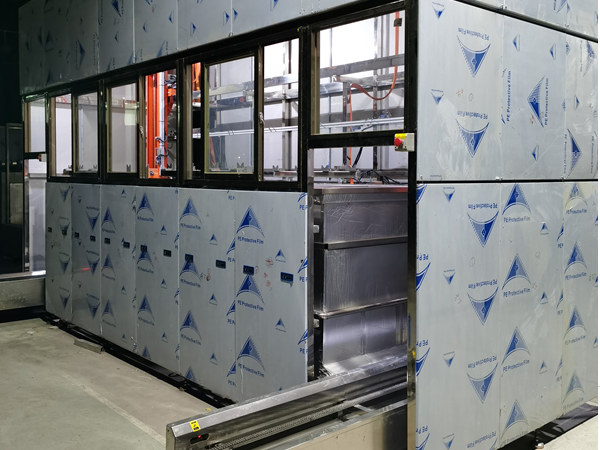 全自動動力電池殼清洗線原理主要是將換能器,將功率超聲頻源的聲能,并且要轉換成機械振動,通過清洗槽壁使...